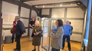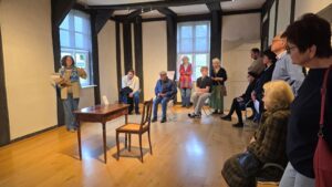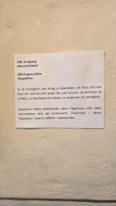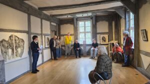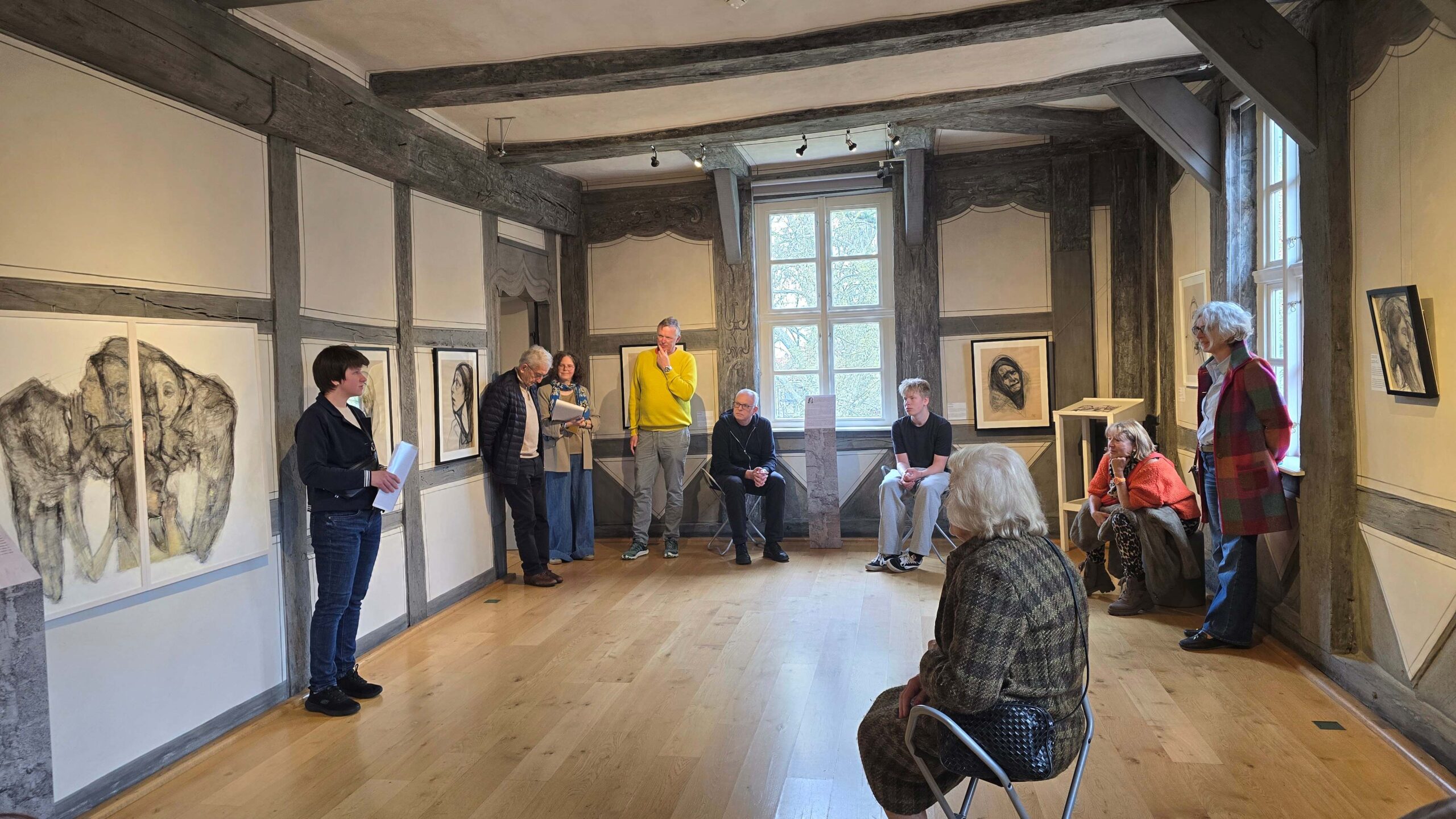 Die Führung durch die Ausstellung „WAR und ist KRIEG“ im Hoffmann-von-Fallersleben-Museum bot den IFK-Mitgliedern eindrucksvolle Einblicke in die künstlerische Auseinandersetzung mit Vergangenheit und Gegenwart von Kriegserfahrungen. Kuratorin Nicole Trnka führte kenntnisreich durch die Ausstellung und vermittelte anschaulich die unterschiedlichen Perspektiven der beteiligten Künstlerinnen. Besonders bewegend war der persönliche Beitrag der ukrainischen Künstlerin Iryna Vorona, Sie schilderte dabei auch ihre eigenen Erlebnisse, die viele der gezeigten Arbeiten prägen und ihnen eine besondere Authentizität verleihen. Die Ausstellung verdeutlicht, wie eng historische und aktuelle Konflikte miteinander verwoben sind und regt zum Nachdenken über Erinnerung, Flucht und Menschlichkeit an. Für die Teilnehmenden war die Führung eine intensive und nachhaltige Erfahrung, die Kunst und persönliche Geschichte auf eindrucksvolle Weise miteinander verband.